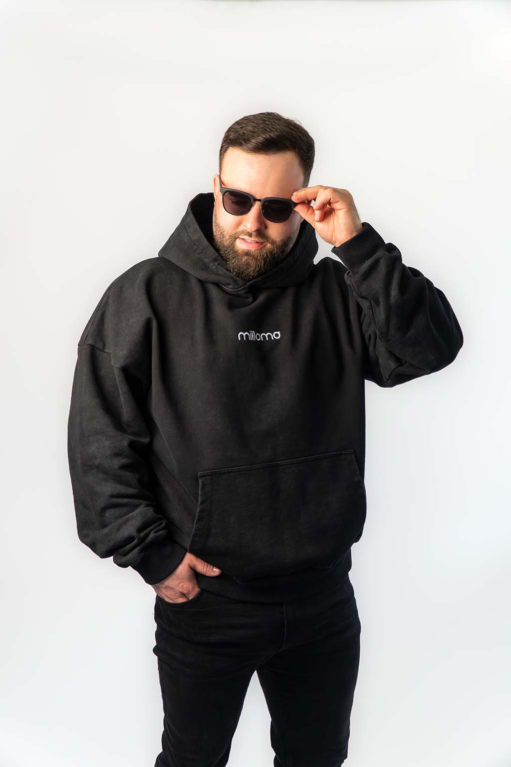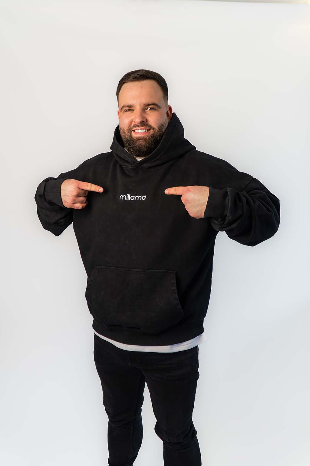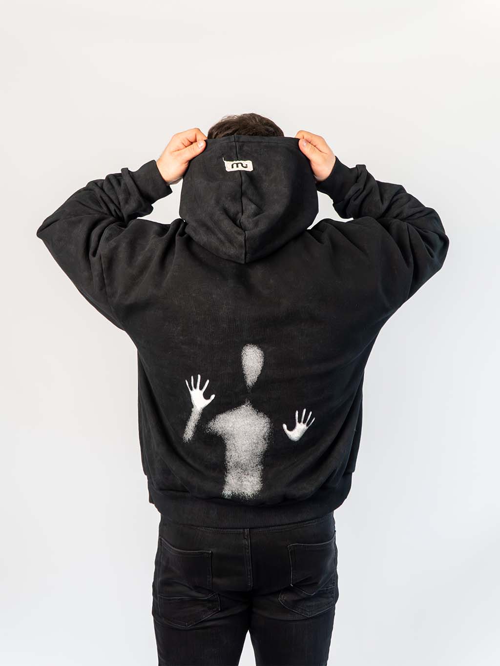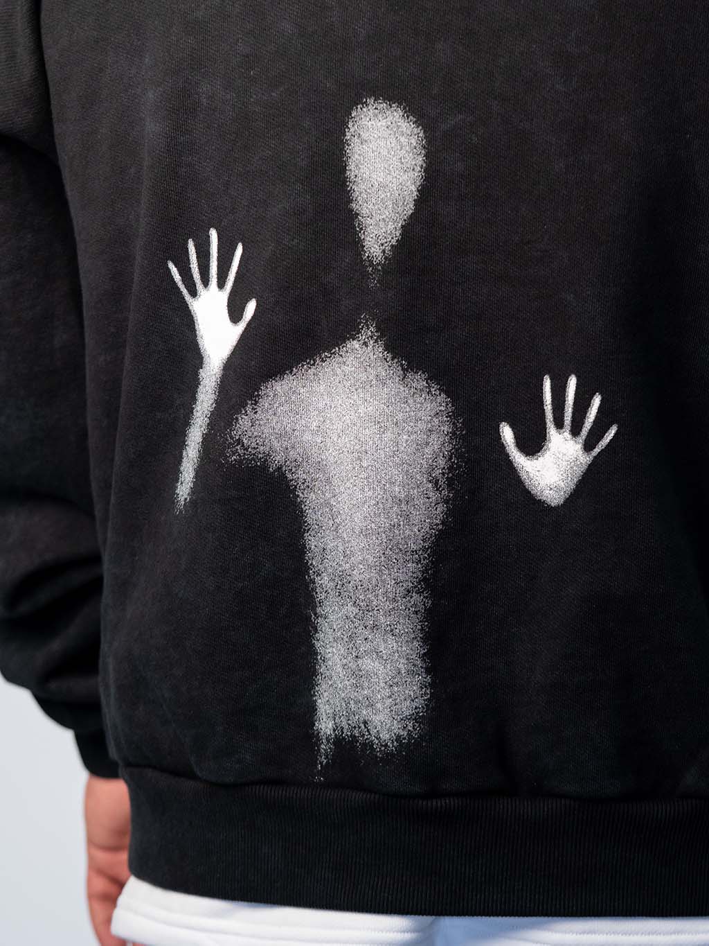 Mięsista bawełna o gramaturze 470 g/m² otula jak ciężki oddech po emocjach, a rozmyty odcisk dłoni na plecach wygląda jak cień wspomnienia. Subtelny haft MILLAMA dopełnia całości — dyskretnie, ale wyraźnie.
