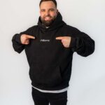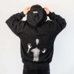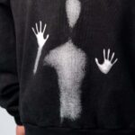Rozmyte, świetliste odciski dłoni na czarnej bluzie tworzą wizualizację energii, która przechodzi z jednej osoby na drugą. To projekt o obecności, intensywności momentu i wymianie, która dzieje się bez słów.