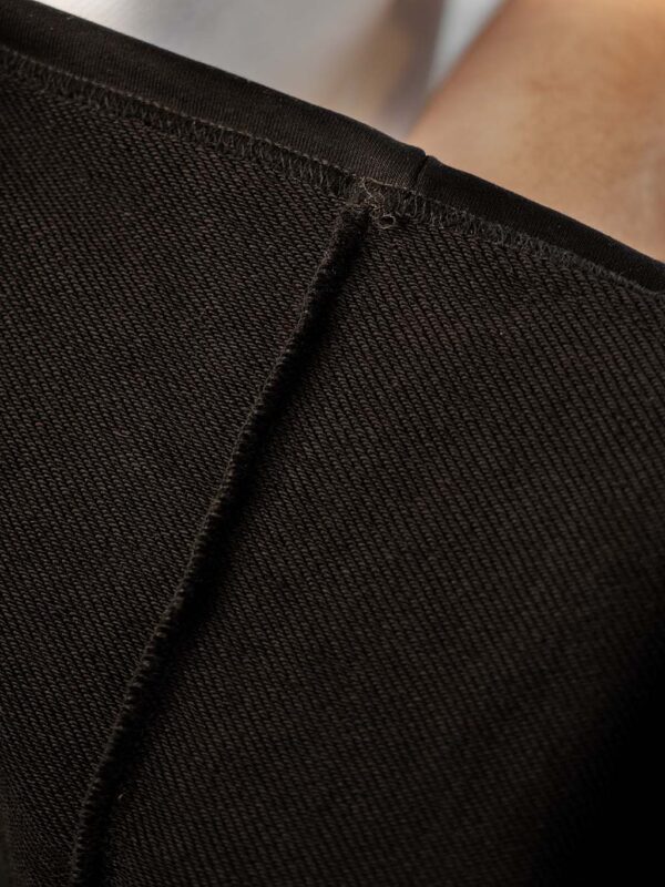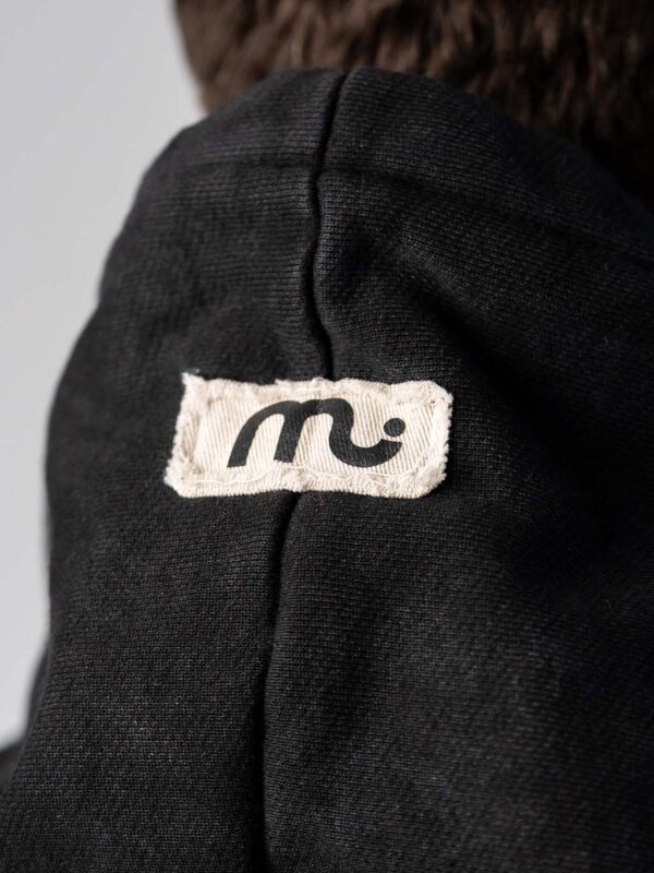 Wszywka z logo umieszczona na kapturze posiada celowo surowe wykończenie. Delikatne strzępienie się krawędzi jest naturalnym i zamierzonym efektem tej techniki, podkreślającym charakter produktu. Nie wpływa ono na trwałość ani jakość użytkowania.